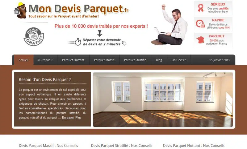 Le parquet massif réclame bien souvent la pose par quelqu’un de métier. Vous pouvez obtenir facilement et rapidement plusieurs devis parquet en vous rendant sur des sites tel mondevisparquet.fr . Simple et facile il ne vous faudra que quelques minutes pour exposer ce que vous souhaitez et recevoir sous quelques jours différents devis pour votre parquet venant d’entreprises de votre région. Une façon de bénéficier du meilleur tarif possible pour vos travaux…